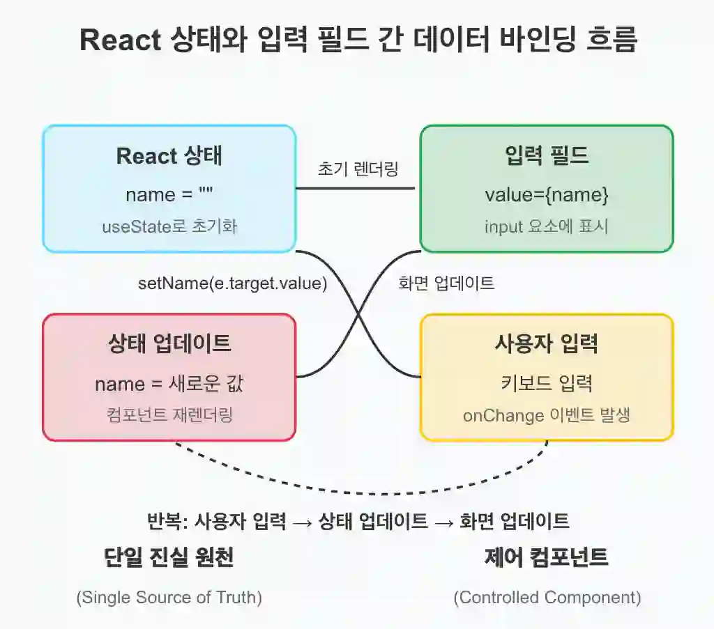 이렇게 하면 상태와 입력 필드 값이 동기화되며, React 상태인 name이 변경될 때마다 컴포넌트가 리렌더링되고, 입력 필드에도 새로운 값이 반영됩니다. 반대로 사용자가 입력 필드 내용을 수정하면 onChange를 통해 상태가 변경되죠. 이처럼 사용자 입력과 상태 간의 흐름이 계속 이어지는 것이 React에서의 데이터 바인딩입니다.
